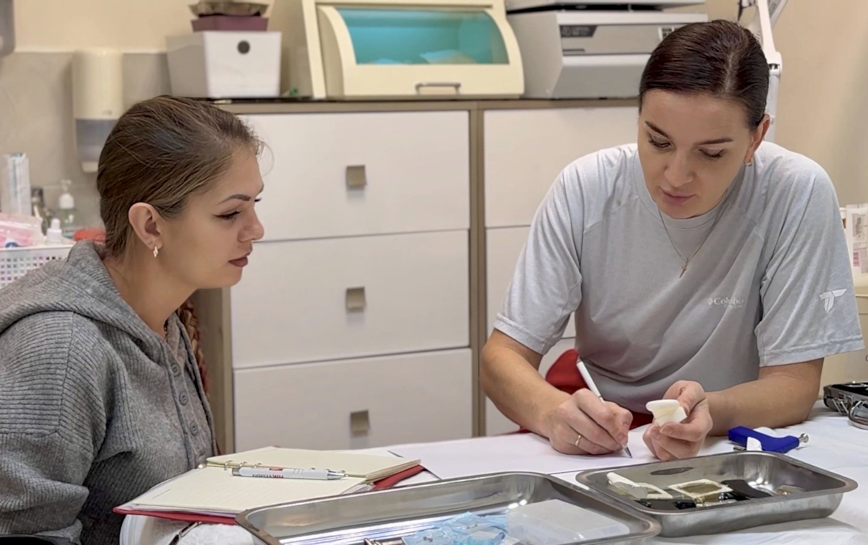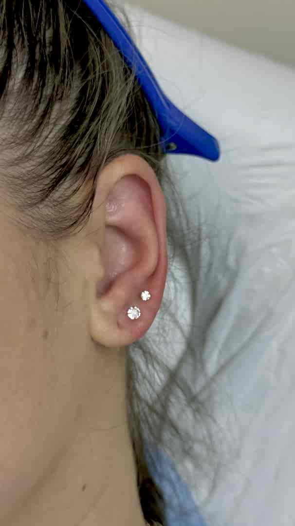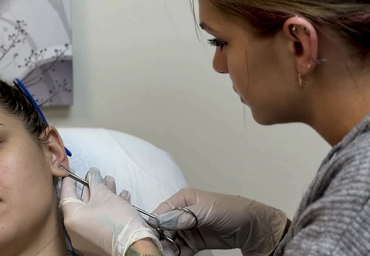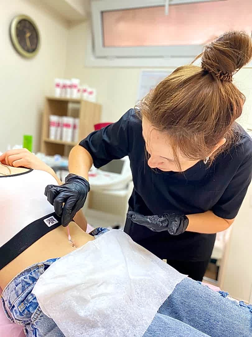 Подготовка к пирсингу, прокол, замена на серьгу, Pin-Up обучение пациента обработке.