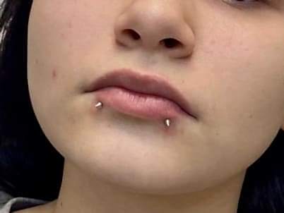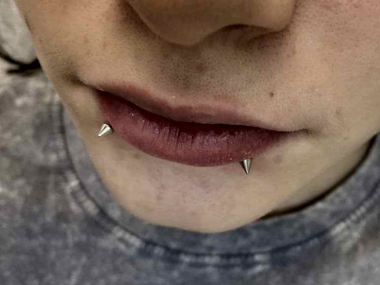 В этом случае основное украшение находится уже под губой, только нижней. А стержень либо проходит под кожей параллельно губе, Pin-Up сквозь неё.
