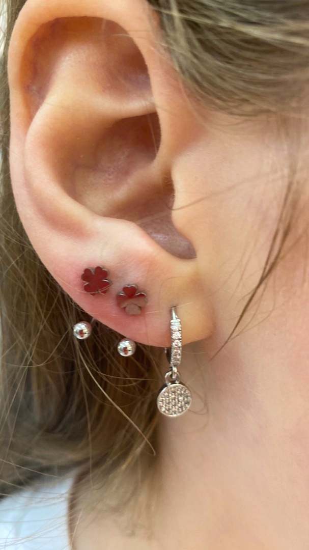 На следующем фото композиция из сережек подобрана под давний Pin-Up который сделан намного ниже положенного места, тут заказчик был настроен не зашивая старый неправильный добавить серьги так, чтоб было очень красиво и саму подборку сделать надо было для коллективного мероприятия с подругой. Часто подруги, в знак одинакового вкуса делают похожие композиции.